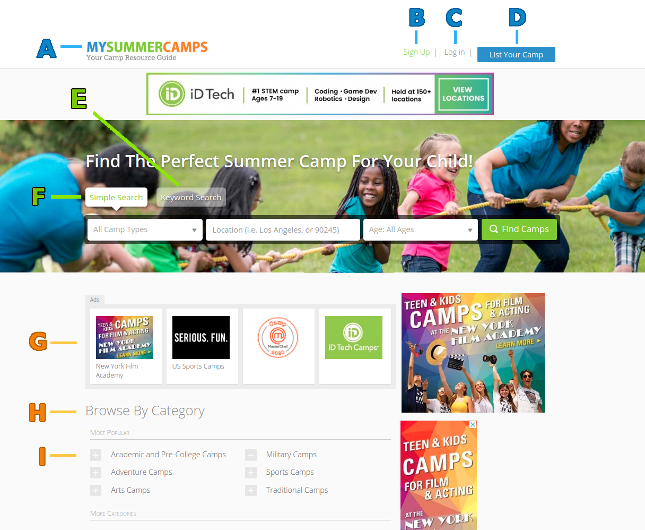 Each letter provides a description of that feature on MySummerCamps.com: